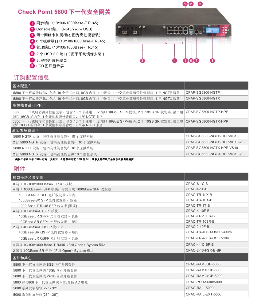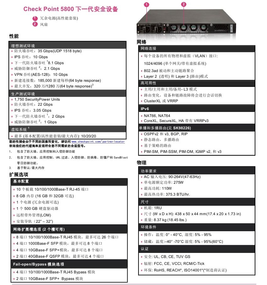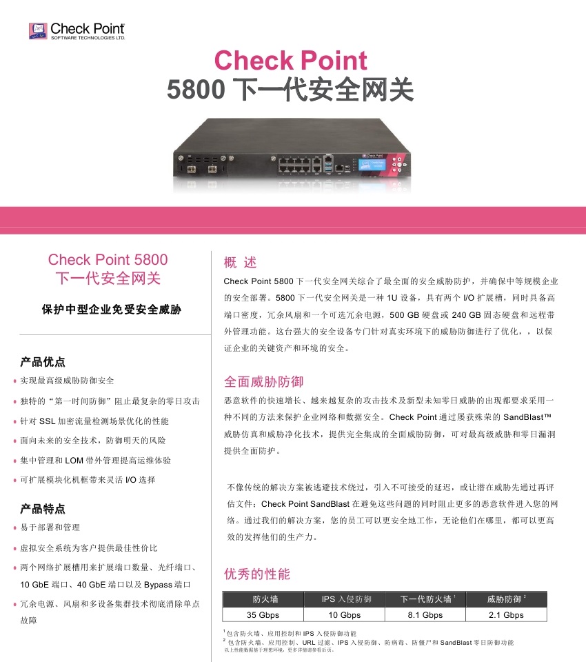 Check Point 5800下一代安全網(wǎng)關(guān)綜合了最全面的安全威脅防護(hù),并確保中等規(guī)模企業(yè)的安全部署。5800下一代安全網(wǎng)關(guān)是一種1U設(shè)備,具有兩個(gè)I/O擴(kuò)展槽,同時(shí)具備高端口密度,冗余風(fēng)扇和一個(gè)可選冗余電源,500 GB硬盤或240 GB固態(tài)硬盤和遠(yuǎn)程帶外管理功能。這臺(tái)強(qiáng)大的安全設(shè)備專門針對(duì)真實(shí)環(huán)境下的威脅防御進(jìn)行了優(yōu)化,,以保證企業(yè)的關(guān)鍵資產(chǎn)和環(huán)境的安全。