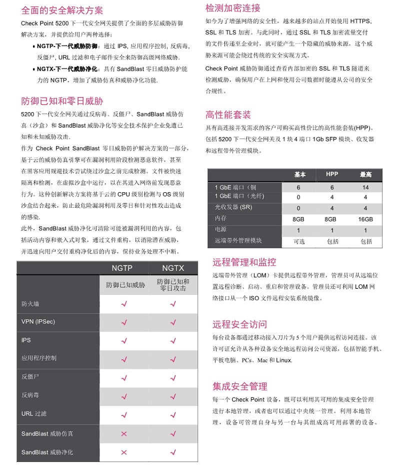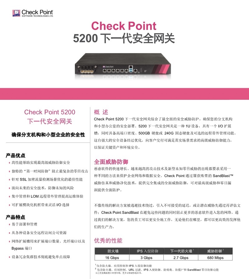 Check Point 5200下一代安全網(wǎng)關(guān)綜合了最全面的安全威脅防護(hù),確保您的分支機(jī)構(gòu)和小型辦公室的安全部署。5200下一代安全網(wǎng)關(guān)是一種1U設(shè)備,具有一個(gè)I/O擴(kuò)展槽,同時(shí)具備高端口密度、500GB硬盤或240G固態(tài)硬盤及可選的遠(yuǎn)程帶外管理功能。這臺(tái)強(qiáng)大的安全設(shè)備經(jīng)過(guò)優(yōu)化,向客戶交付可滿足真實(shí)場(chǎng)景需求的高級(jí)威脅防御能力,以保證關(guān)鍵資產(chǎn)和環(huán)境安全。