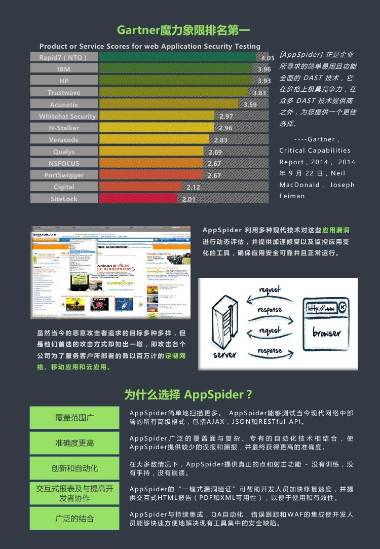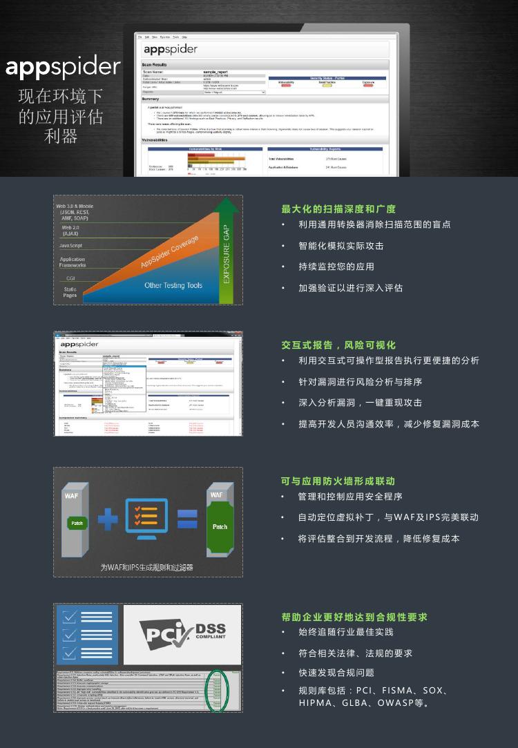 雖然當今的惡意攻擊者追求的目標多種多樣,但是他 們首選的攻擊方式卻如出一轍,即攻擊各個公司為了 服務(wù)客戶所部署的數(shù)以百萬計的定制網(wǎng)絡(luò)、移動應(yīng)用 和云應(yīng)用。AppSpider 利用多種現(xiàn)代技術(shù)對這些應(yīng)用的 漏洞進行動態(tài)評估,并提供加速修復(fù)以及監(jiān)控應(yīng)用變 化的工具,確保應(yīng)用安全可靠并且正常運行。