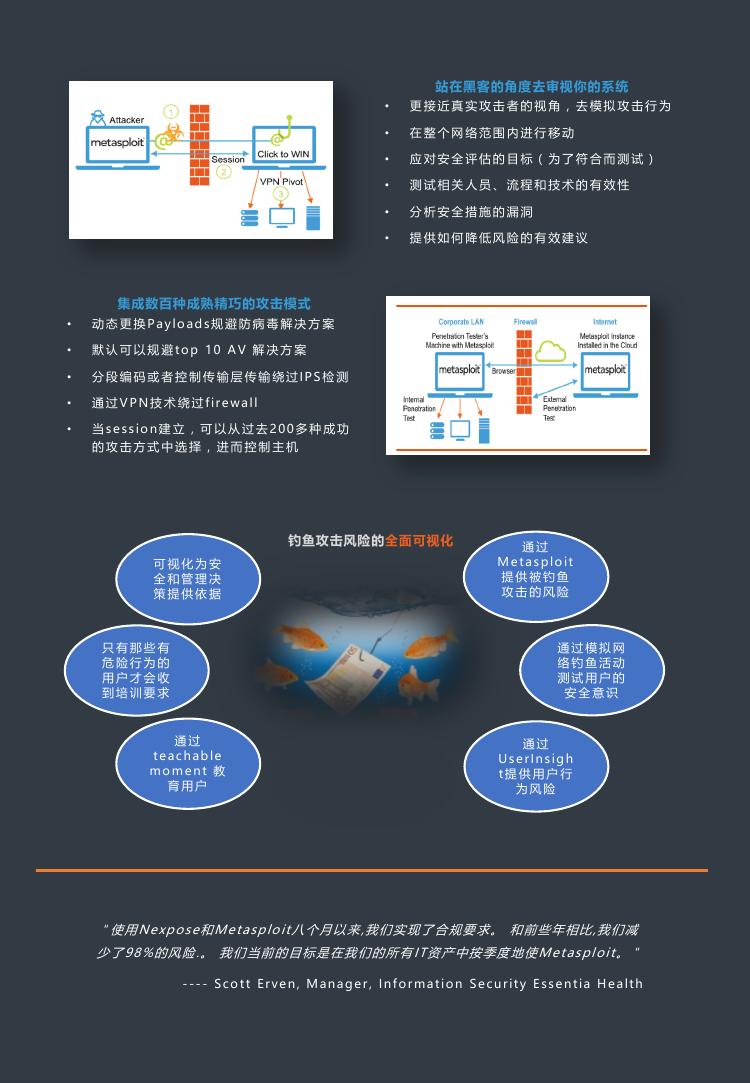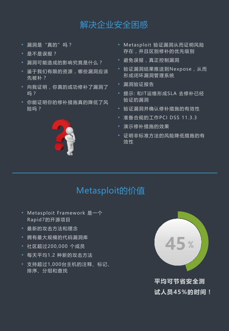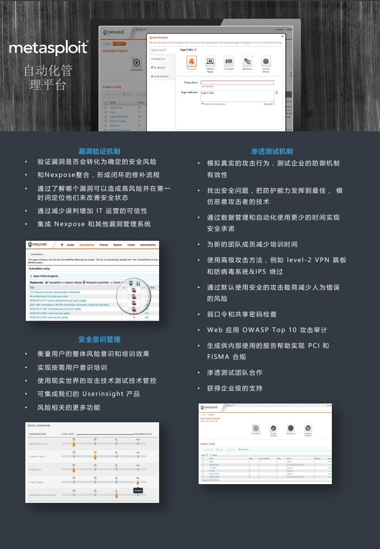 模擬真實攻擊,在惡意攻擊者之前發(fā)現(xiàn)自己的弱點。Metasploit Pro 完全能夠讓您利用 Metasploit? 的偵察和漏洞利用模塊開源框架,從而加快您的滲透測試。利用攻擊者技術(shù)逃脫防病毒軟件監(jiān)控,發(fā)現(xiàn)較弱的憑據(jù),并在整個網(wǎng)絡(luò)內(nèi)運轉(zhuǎn)。